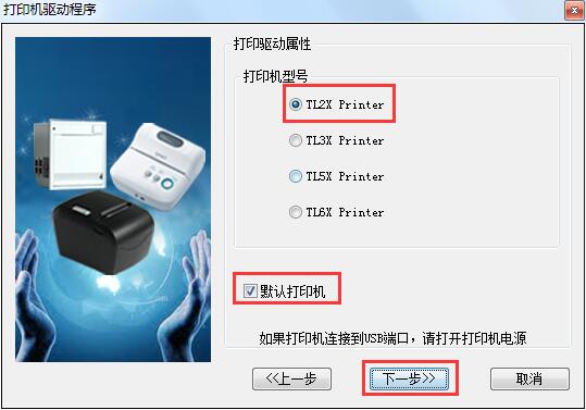 4.选择打印机型号【TL2X Printer】,勾选是否默认打印机,然后知识兔单击【下一步】