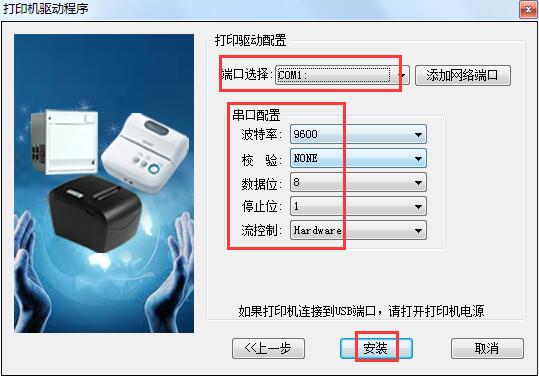 5.配置打印机,知识兔选择端口和串口参数,单击【安装】