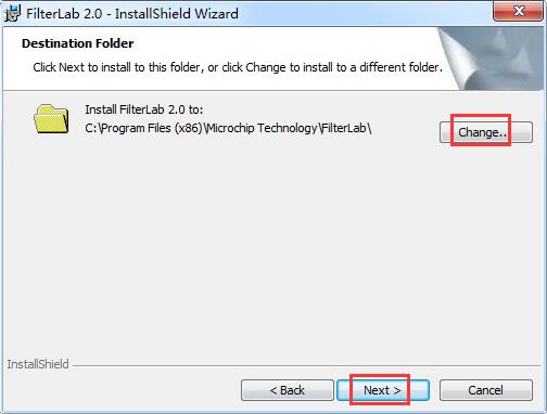 3.选择FilterLab安装位置,默认是C:\Program Files (x86)\Microchip Technology\FilterLab\,知识兔选择其他文件夹单击【change】
