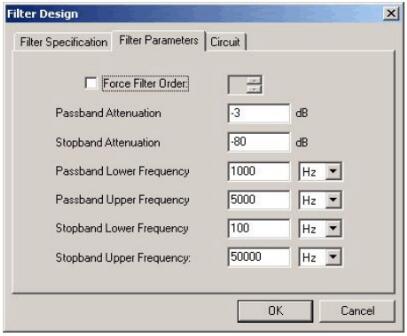 滤波器规格标签使用户能够指定逼近类型、通过方式要求和增益。选择任何逼近方法、逼近方式的通过方式以及整体滤波器增益。最大允许的增益为10V/V。确定逼近类型、通过方式要求和增益后知识兔点击OK或滤波器参数选择框。