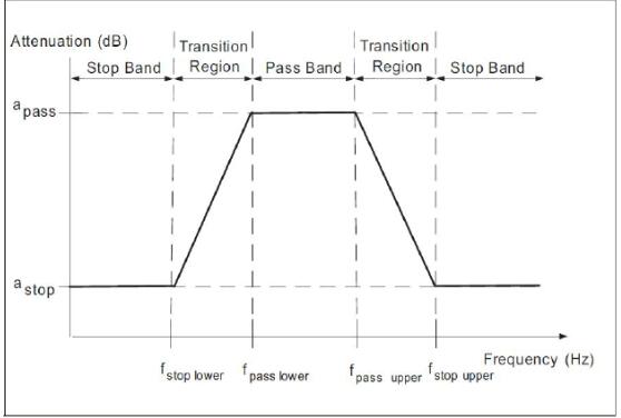 滤波器参数选择框(Filter Parameter’s Tab)如图显示了通带,阻带。对于所有的通过性,apass和astop表示通带和阻带衰减,对于低通(高通)通过方式fpas 和fstop 带通和带阻频率,对于低通通过方式,fpass upper和fpass lower表示通带上限和下限频率,fstop upper和fstop lower表示阻带上限和下限频率。