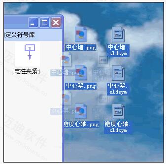 4.添加新的符号到符号库:首先需要有一个SolidWorks块文件(.sldblk ,.sldsym), 然后知识兔为此块文件制作一张同名称的.png格式小截图(这里可以用程序主菜单中的”迈迪截图工具”),最后将截图和块文件同时拖入到自定义符号库中,如下图: