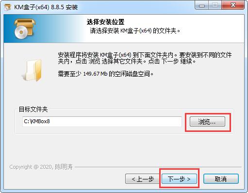 4.选择软件的安装文件夹,默认的是【C:\KMBox8】,单击【浏览】修改