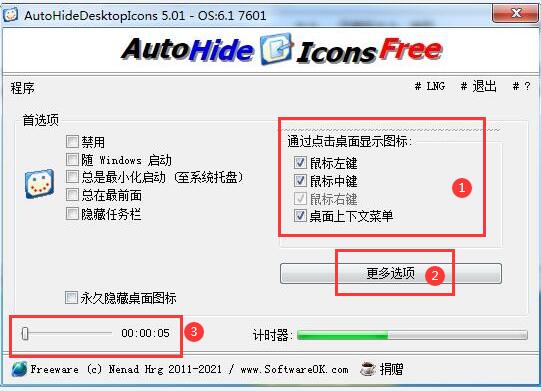 3。然后知识兔将定时器设置为最大值(见下图3区域)。所以!现在,当您使用鼠标中键单击桌面时,桌面图标将被隐藏。如果知识兔要再次查看符号,知识兔可以按鼠标右键或左键。