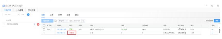 2、一键同时扫描局域网内多个网段的矿机,扫描完成后,主机列表显示矿机的基本信息,如矿工名、IP地址、运行状态、当前所挖币种、算力、温度、风扇转速、显卡信息、运行时长、版本号等信息。(仅支持3.0.X及以上版本扫描矿机)