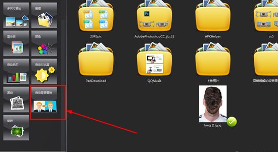 1、现在很多照片都可以进行照片底色的更换,只要是纯色背景的照片都可以利用图片馆软件实现换背景的目的,在左边的批处理中找到”自动背景替换”功能,如下图所示: