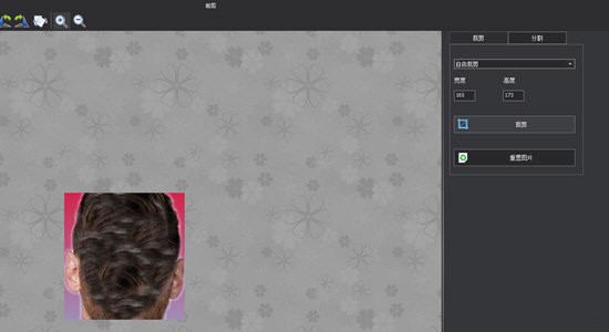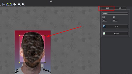 2、弹出分割的界面后,一共有两种切割方式供大家选择,大家可以在右边的功能栏中在找到”裁剪”和”分割”找到两种功能,先来说说裁剪,知识兔小编选择的是自由裁剪,裁剪就是利用裁剪框进行照片图片的选择,知识兔选择框中的区域就是保留的最终区域,如下图所示: