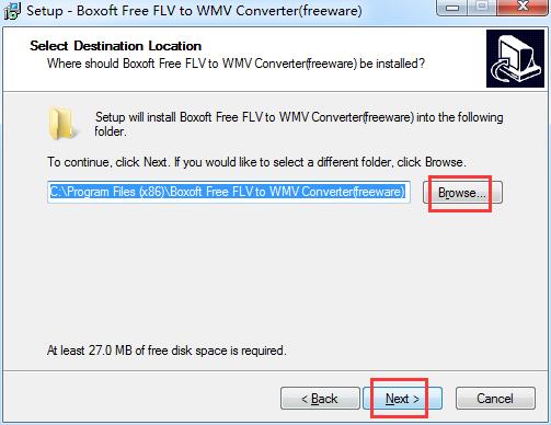 3.选择软件的安装位置,默认的是【C:\Program Files (x86)\Boxoft Free FLV to WMV Converter(freeware)】,单击【browse】修改