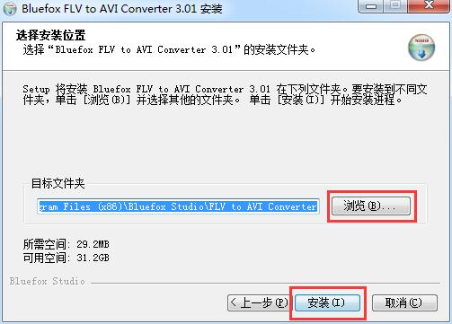3.选择软件的安装目的地,默认的是【C:\Program Files (x86)\Bluefox Studio\FLV to AVI Converter】,单击【浏览】修改,单击【安装】开始安装