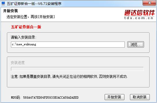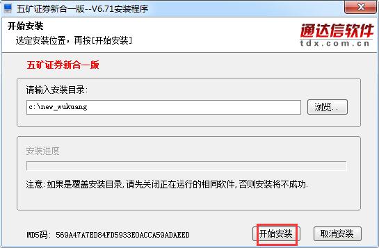 2.选择安装位置,默认是【c:\new_wukuang】,单击【浏览】修改,确认以后单击【开始安装】即可