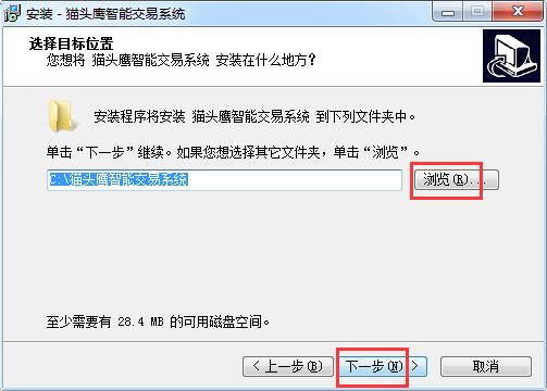 2.选择猫头鹰智能交易系统安装目标位置,默认为【C:\猫头鹰智能交易系统】,单击【浏览】自定义