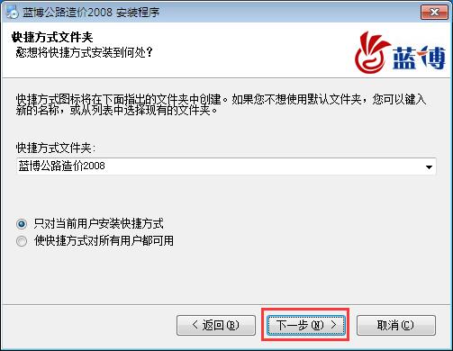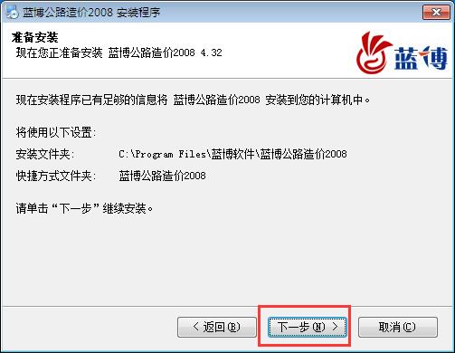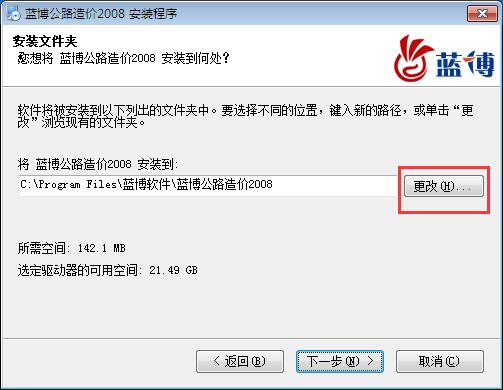 2.选择安装文件夹,默认的是【C:\Program Files\蓝博软件\蓝博公路造价2008】,想选择不同的位置知识兔点击【更改】