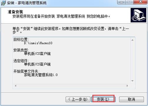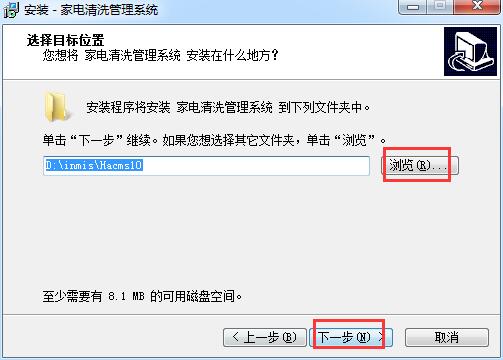 3.选择家电清洗管理系统的安装目的地,默认的是【D:\inmis\Hacms10】,单击【浏览】选择其他文件夹