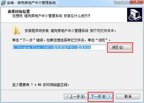 3.选择软件的安装位置,默认的是【C:\Program Files (x86)\维克房地产中介管理系统】,单击【浏览】修改