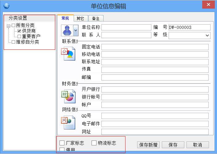 在单位编辑窗口的左则是单位分类栏,分类设置采用了”树型多选”分类模式,此项在录入时必须选择一条。