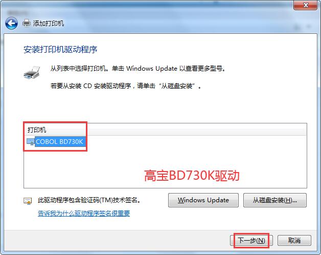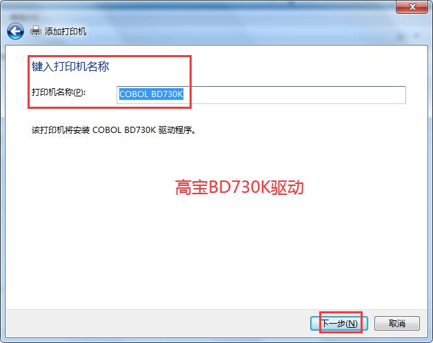 7.选择打印机【COBOL BD730K】,单击【下一步】
