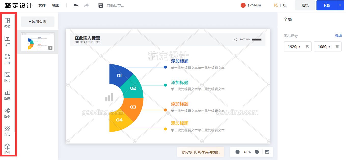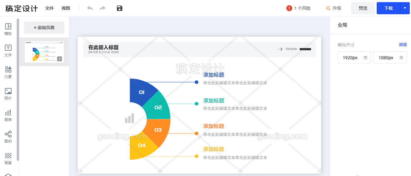 要想制作ppt图形图表,首先你需要做的便是获取一个适合自己的图表模板,而这可以在稿定在线设计网站中获取素材。
