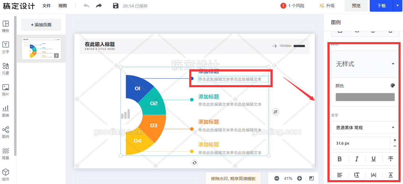 根据图表模板中的提示,进行文字的增删,文字的字体、颜色、大小或是其他可以通过右侧的菜单栏完成修改: