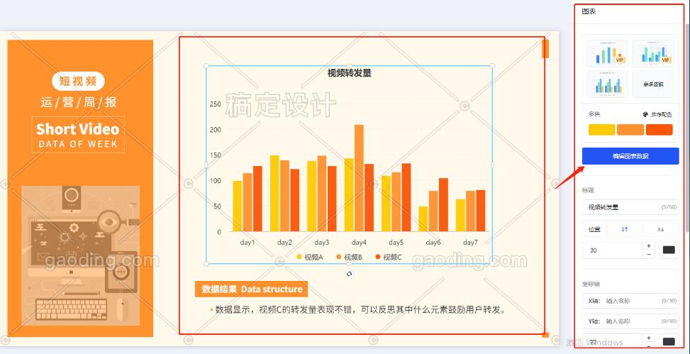 首先,在稿定设计网站,找到一个自己喜欢的ppt数据图表模板,然后知识兔就可以对这个模板进行编辑。首先知识兔双击图表编辑数据,然后知识兔点击【导入数据】就可以对数据进行一个修改。