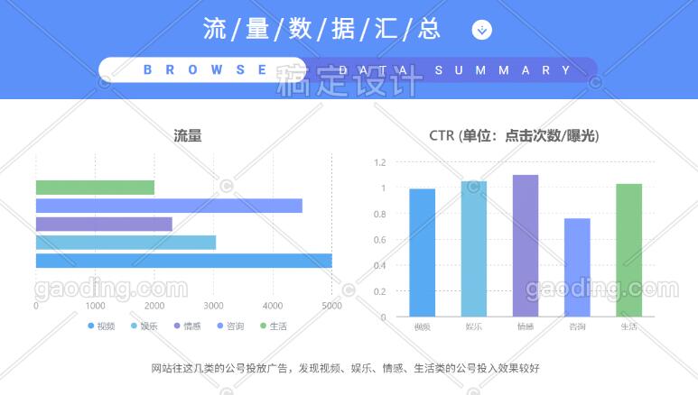 首先这一款流量数据汇总ppt模板是上下排版行的,并且知识兔使用多个图表镶嵌的方式来展现,看起来非常的直观。