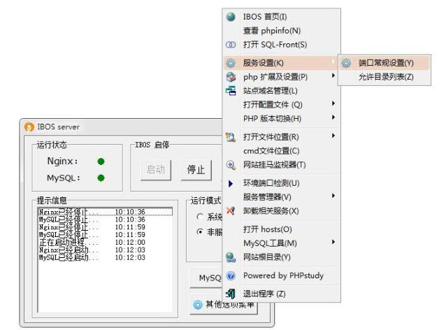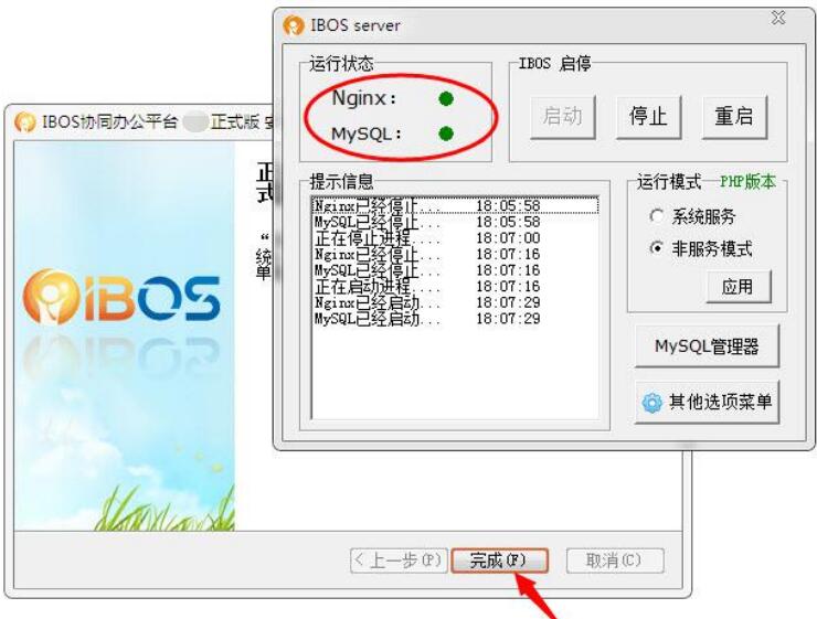 5.安装完成系统会弹出控制中心,也就是 IBOSserver,访问系统的前提就是控制中心需要处于”启动”,并且知识兔 Nginx 和 MySQ 亮绿灯。如果知识兔有一个是亮红灯,请确定安装的时候是否弹出端口占用提示。控制中心启动成功后,知识兔点击”完成”就可弹出 IBOS 安装信息填写页。