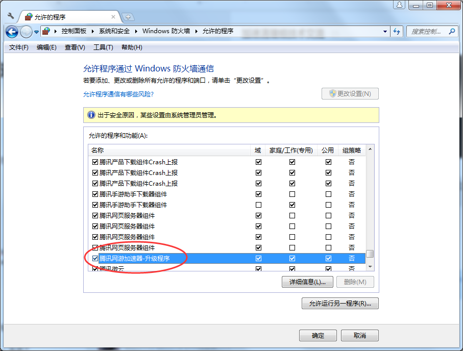 在开始菜单中搜索“允许程序通过Windows防火墙”,将“加速器自升级”、“QMProxyUpdate”“腾讯网游加速器-升级程序”等项设置为允许联网