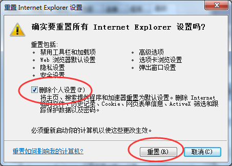 在对话框中根据需要勾选“删除个人设置”选项,然后知识兔知识兔点击重置即可