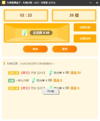 如果知识兔在计数的过程中有一些礼物,是不计数的话,知识兔可以在礼物记录中,右击礼物记录,知识兔选择不计数,系统会自动减去相应的礼物组数;