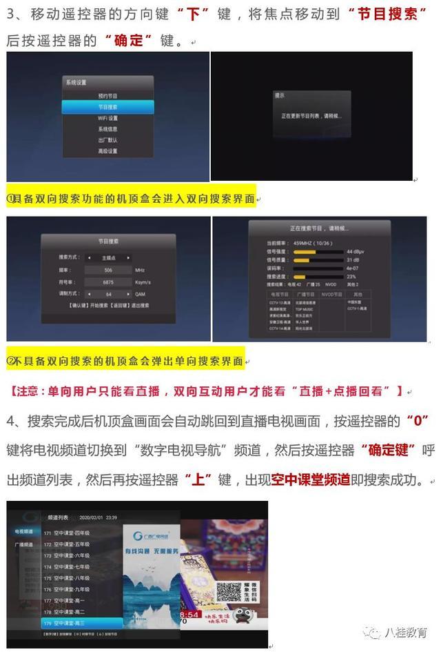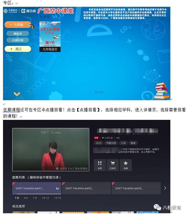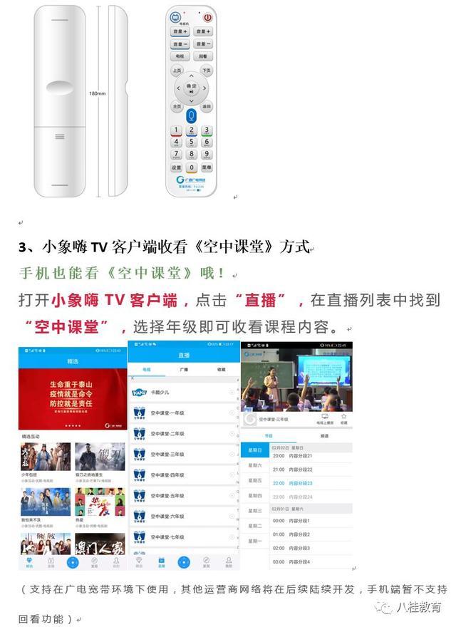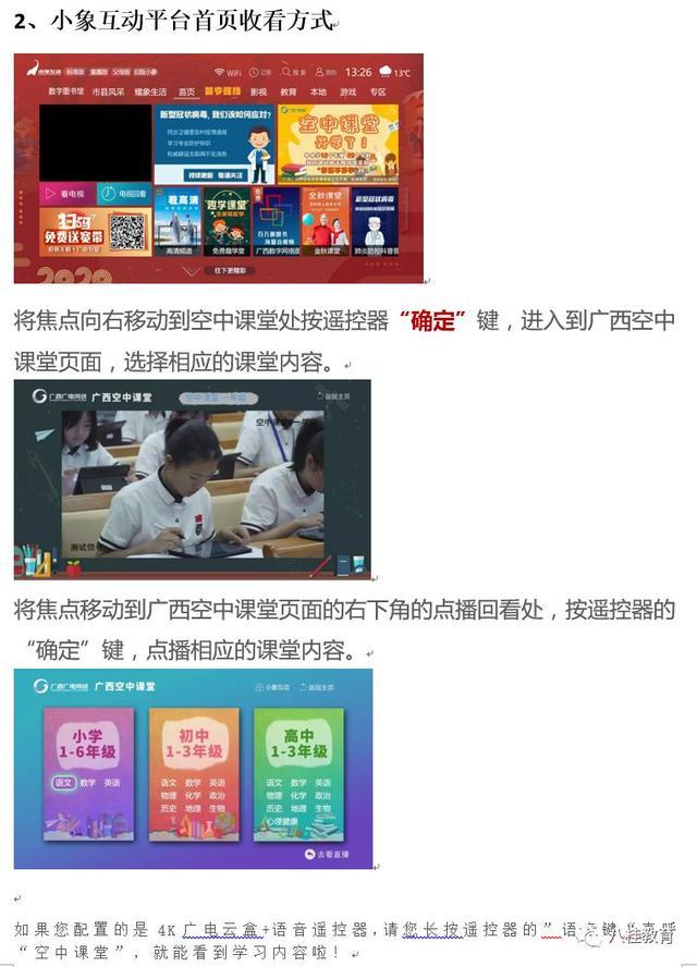广西广电网络采用“直播+点播回看”模式。首先,按电视遥控器的“菜单”键(或“导视”键),知识兔选择“节目搜索”,搜索完成更新后,0频道列表的后12个频道为“空中课堂”频道;同时也可直接进入小象互动首页,知识兔选择空中课堂栏目进行观看;知识兔点击“点播回看”,可点播相应的年级和学科课程内容。
