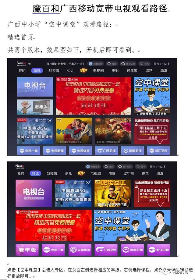 按遥控器“主页”键(或“首页”键),进入广西电信、广西联通光纤电视(IPTV)首页,在首页找到“空中课堂”专栏进入观看。