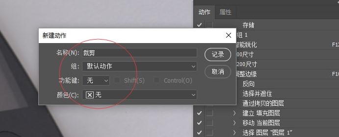 3.设置好之后我们知识兔点击记录,这时动作面板下方的圆形按钮变为红色,表示“动作”命令已经开始进行录制,接下来的每一步的操作都会被记录下来,最后生成一个连续的步骤,这就是动作。